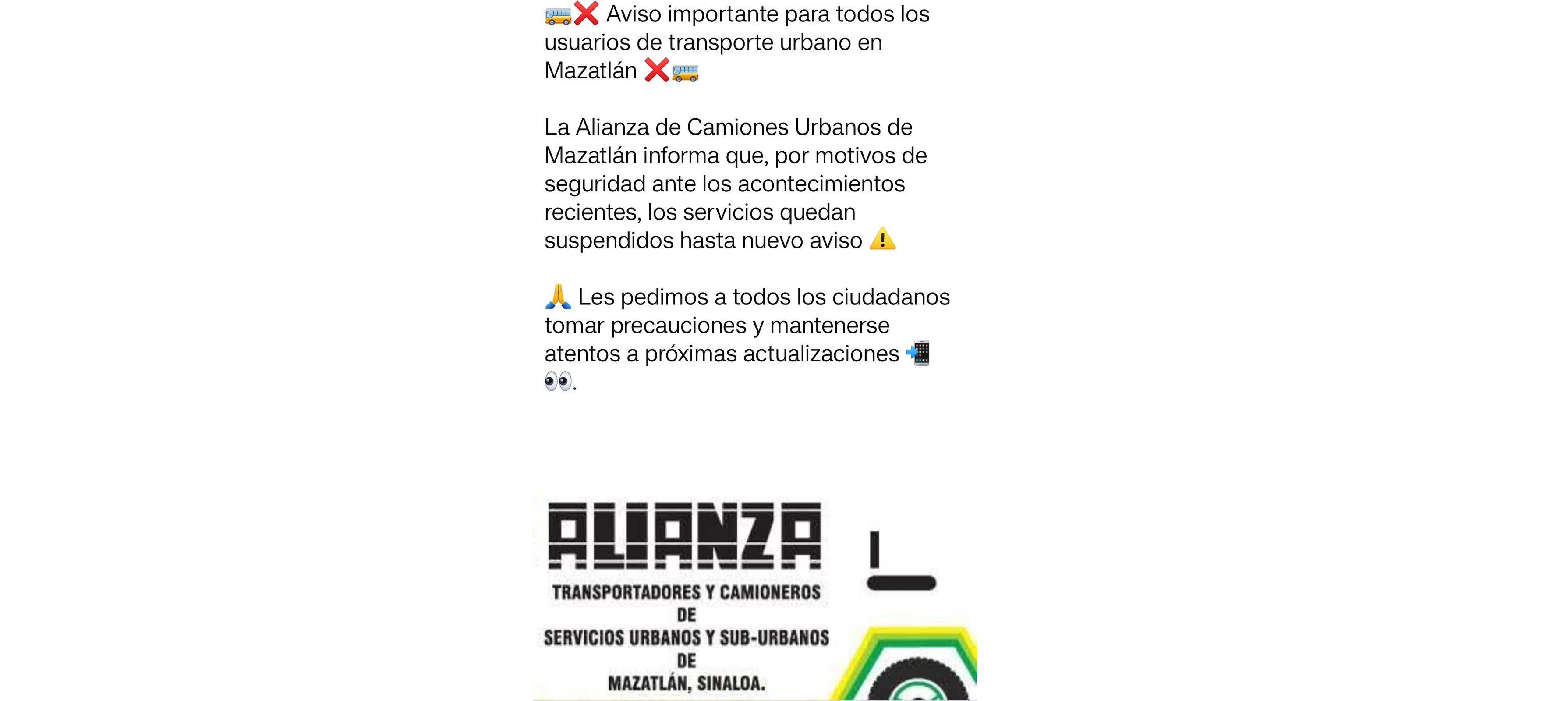 Debido a los bloqueos que se registraron este mediodía en Villa Unión, y ante una posible extensión de los hechos violentos, la Alianza de Camiones Urbanos de Mazatlán informó que solo se mantendrán activas las rutas céntricas y de la zona turística en lo que resta del domingo.